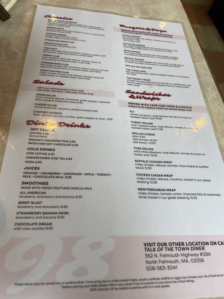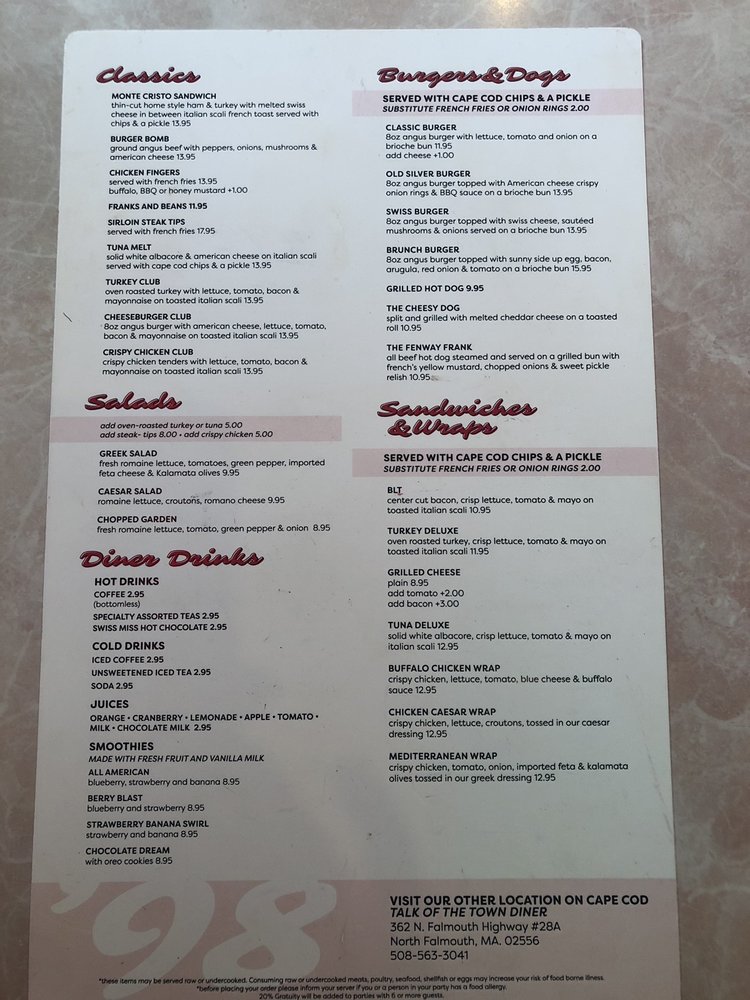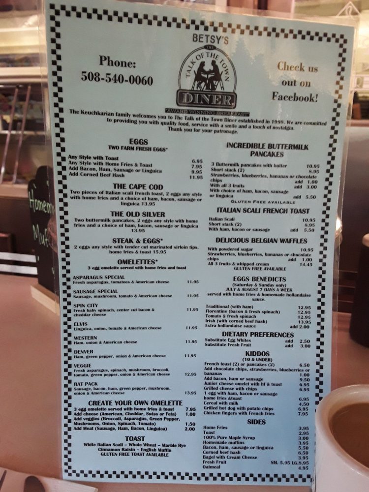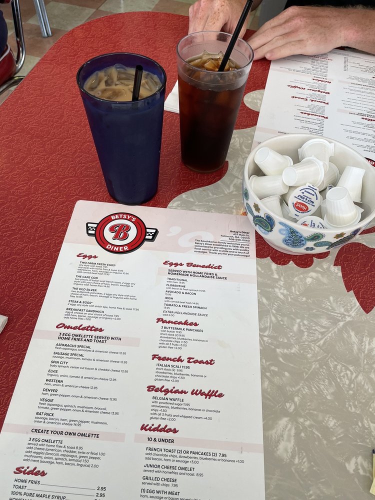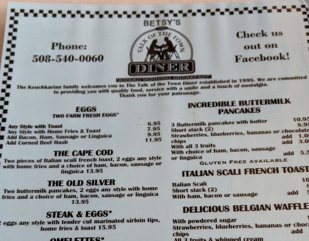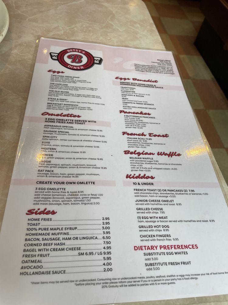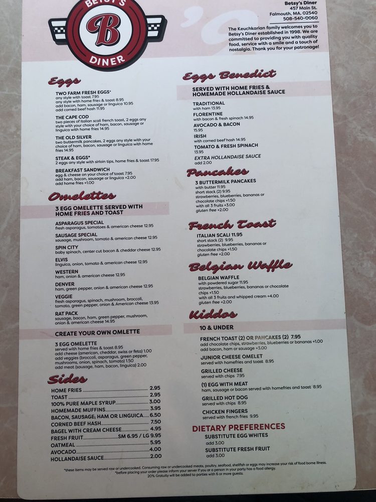 Introducing the menu at Betsy's Diner, an American diner located in Falmouth, MA, where the breakfast offerings steal the spotlight. From classic eggs any style to specialty omelettes like the Rat Pack with a mix of sausage, bacon, ham, and more, the menu caters to every preference. Customers rave about the friendly service, generous portions, and delightful ambiance reminiscent of a 50's era diner. The standout dish, the Cape Cod breakfast, features Italian scali French toast, eggs any style, and a choice of breakfast meats, all served with home fries. With an array of vegetarian options and gluten-friendly items available, Betsy's Diner ensures that everyone can enjoy a satisfying meal. Don't miss out on the scrumptious breakfast offerings and charming atmosphere of this diner, a must-visit in Falmouth.